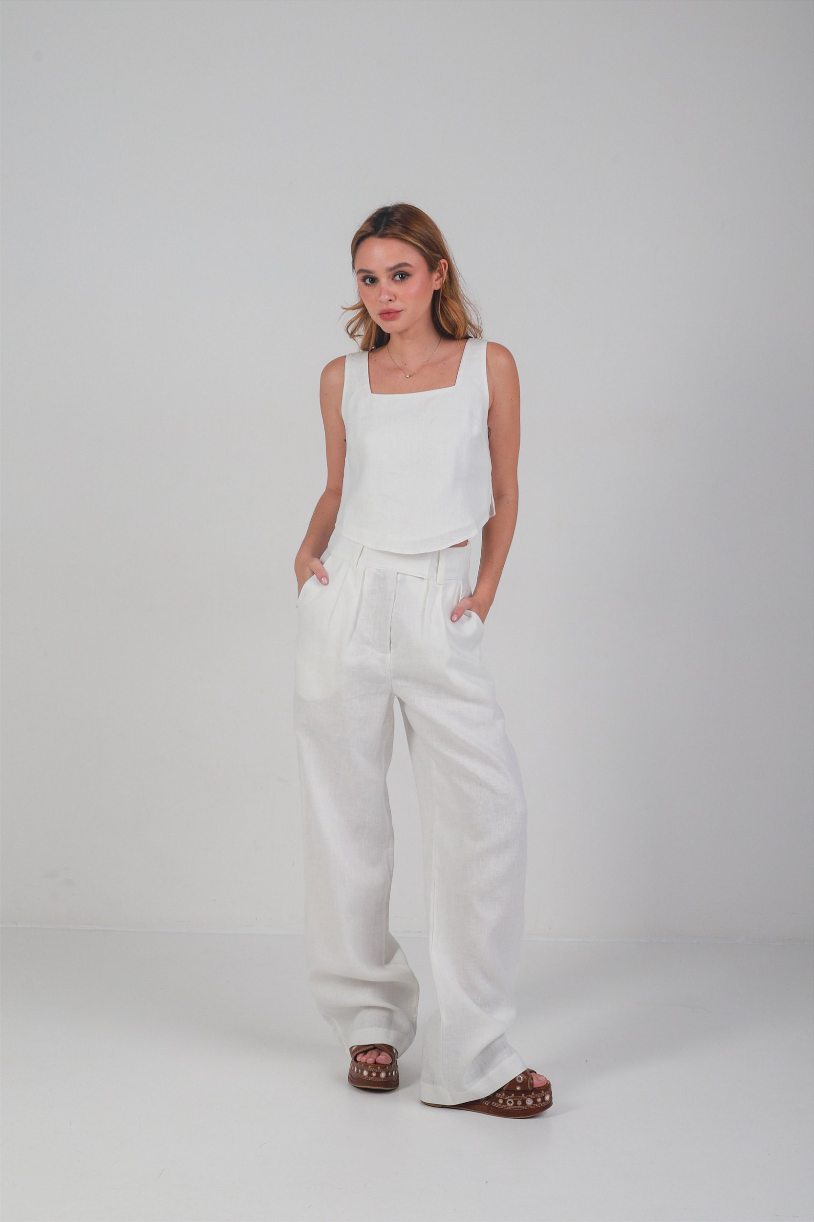 Calça confeccionada em linho puro, de toque natural e caimento impecável. A modelagem de alfaiataria traz sofisticação imediata ao visual, com pregas frontais que alongam a silhueta e garantem movimento, além do cós estruturado que valoriza a cintura com elegância.
