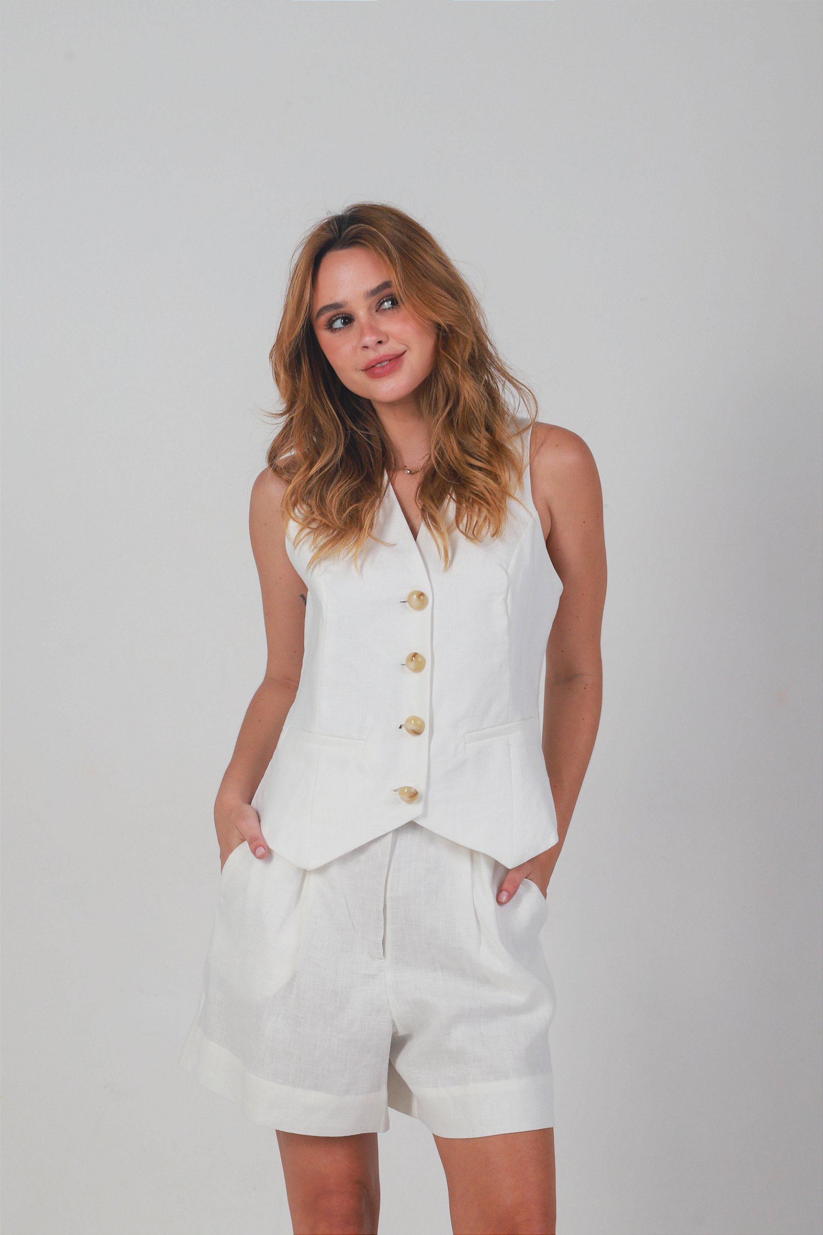 Colete confeccionado em linho puro, com estrutura de alfaiataria e acabamento impecável. A modelagem clássica é valorizada pelo decote em V e pelo fechamento frontal com botões ecológicos tingidos na cor do tecido, que reforçam o cuidado com os detalhes e a proposta sofisticada da peça.