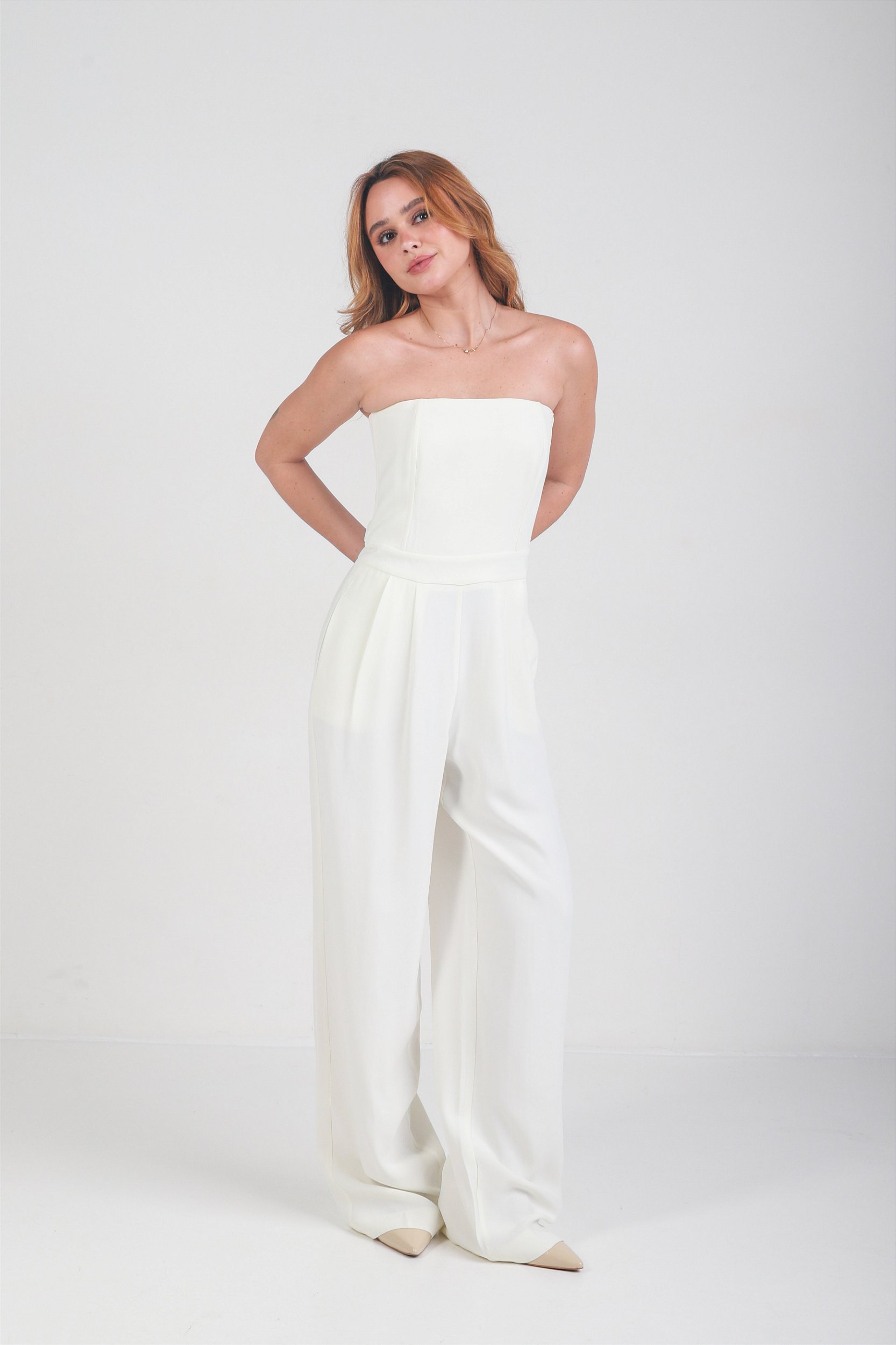 Macacão confeccionado em crepe de acetato de fabricação brasileira, com toque elegante e caimento fluido. O modelo tomara que caia possui busto estruturado com lastex nas costas, garantindo conforto e ajuste perfeito ao corpo.